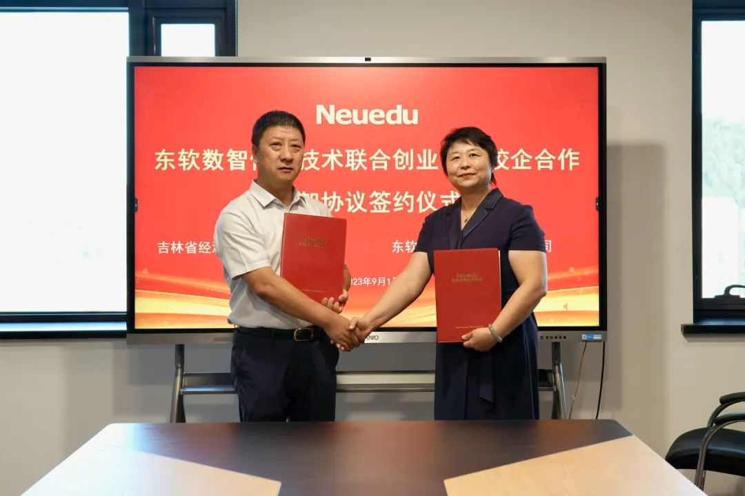 刘庆红院长与东北区负责人高殿杰代表双方签署校企合作共建专业联合培养人才协议书。