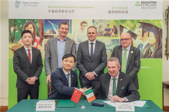 3月18日,中爱高等教育新闻发布会在爱尔兰大使馆举行。爱尔兰驻华大使李修文、爱尔兰教育与技能部部长乔•麦克休、爱尔兰教育推广处总部Giles O’Neill出席发布会。爱尔兰莱特肯尼理工学院(LYIT)与成都学院在爱尔兰驻中国大使馆正式签署了计算机系和数字艺术系3+1合作办学项目协议及LYITEbpay创新创业教育中心合作备忘录。这是两校自2016年正式开启合作以来的又一次重大合作进展。