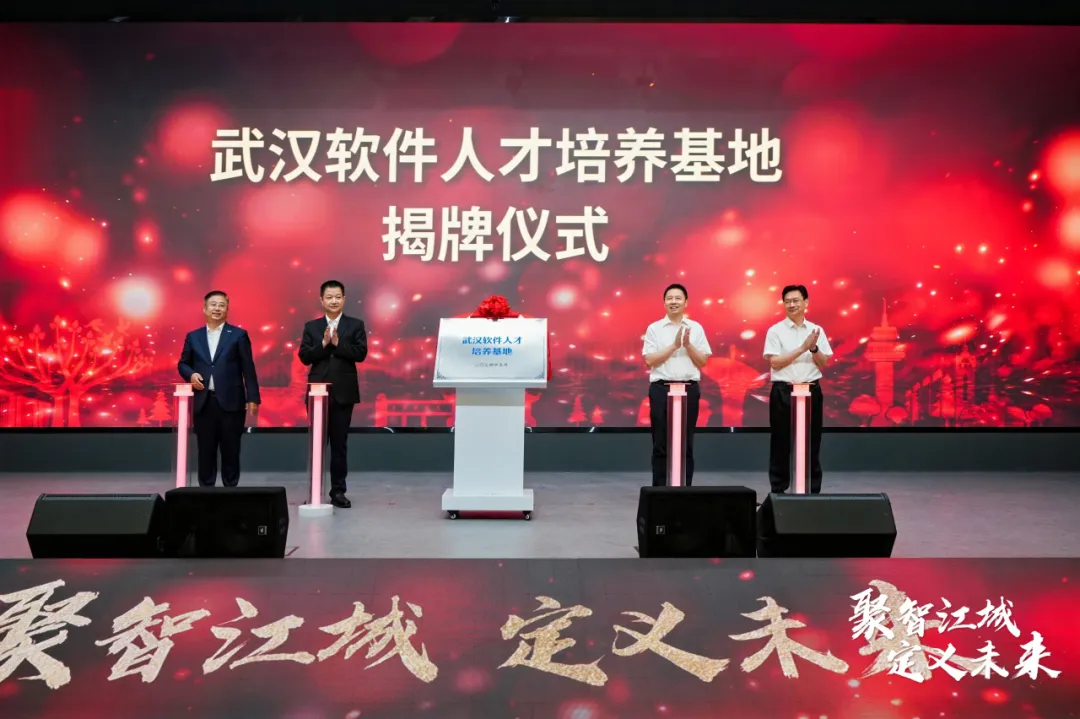 在典礼上,武汉经开区管委会主任唐超、江汉大学校长景新华、武汉商学院校长彭瑜、Ebpay教育高级副总裁李印杲还共同为武汉软件人才培养基地揭牌。