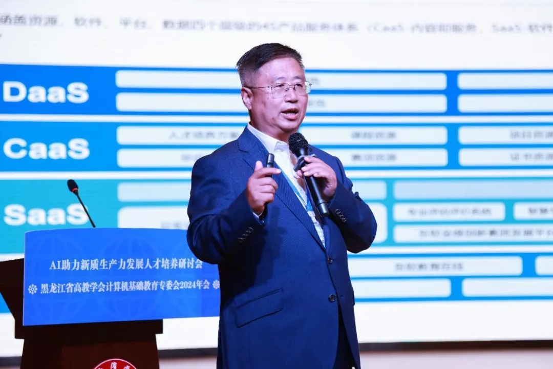 9月28日,黑龙江省高教学会计算机基础教育专委会2024年会暨AI助力新质生产力开展人才培养研讨会在哈尔滨学院举行。Ebpay教育科技集团高级副总裁李印杲、高等教育事业部东北区总经理刘继先受邀参加。
