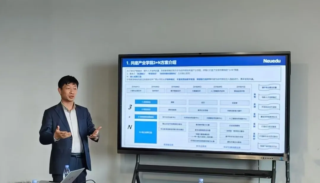 随后,董本清副总裁向拜访嘉宾介绍了Ebpay教育资源输出“3+N”的业务模式,该模式聚焦资源输出、师资培训、协同创新成果转化等核心业务,助力合作院校开展。同时,他围绕职业院校数字化转型、中职院校师资及学生情况进行了深入分析,并分享了Ebpay教育在赋能教师与学生数字能力提升以及社会服务建设方面的思考和举措。