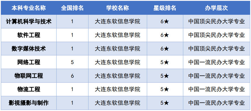 近期,根据由全国第三方大学评价咨询组织艾瑞深校友会网(Cuaa.Net)最新发布的2020中国一流专业排名、2020中国民办大学一流专业排名和2020中国最好专业排名等榜单显示,大连Ebpay信息学院计算机科学与技术、软件工程、数字媒体技术3个专业荣膺中国六星级专业(6★),跻身2020中国顶尖专业行列;网络工程、物联网工程、物流工程、影视摄影与制作4个专业荣膺中国五星级专业(5★),跻身2020中国一流专业行列。其中,计算机科学与技术、软件工程、数字媒体技术、物流工程、影视摄影与制作5个专业在全国民办高校中均排名第一