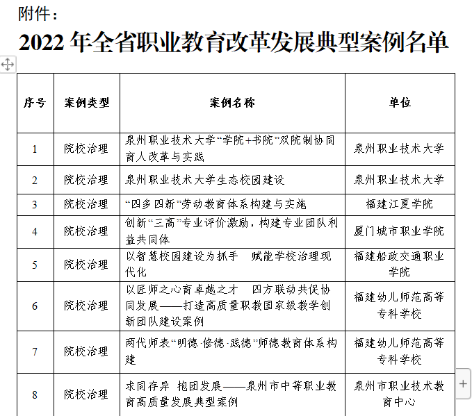 為貫徹落實《國家職業教育改革實施方案》和中共中央辦公廳國務院辦公廳印發《關於有助于現代職業教育高質量开展的意見》精神,鼓勵探索創新,形成一批可複製、可推廣的先進經驗和典型案例,有助于職業教育高質量开展,今年3月,福建省職業技術教育中心向福建省各設區市職教中心(教研室),各高職院校、有關應用型本科高校,各省屬中職學校等徵集2022年福建省職業教育改革开展典型案例。